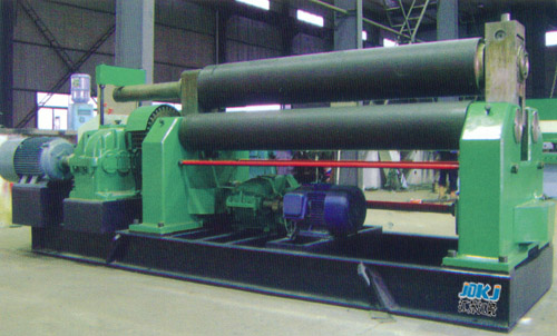 本機(jī)結(jié)構(gòu)為三輥對(duì)稱式,上輥在兩下輥中央對(duì)稱位置作垂直長(zhǎng)降運(yùn)動(dòng),通過絲桿絲母蝸桿,傳動(dòng)而獲得,兩下輥?zhàn)餍D(zhuǎn)運(yùn)動(dòng),通過減速機(jī)的輸出齒輪與下輥齒嚙合,為卷制板材提供扭矩。